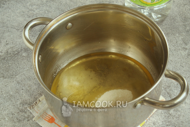 До кипения доведите рафинированное масло с уксусом, солью, сахаром. Чтобы масло не брызгало за борт, выбирайте просторную емкость.