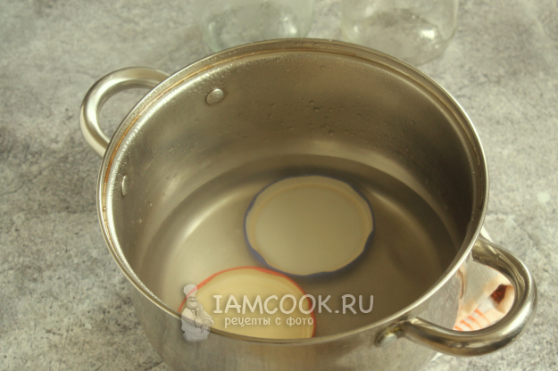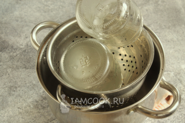 Над кипятком установите дуршлаг и вставьте горлышками вниз чистые банки (простерилизуйте на огне 10 минут).