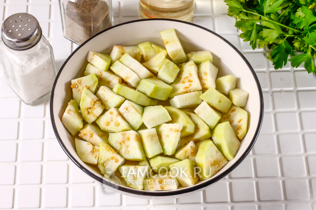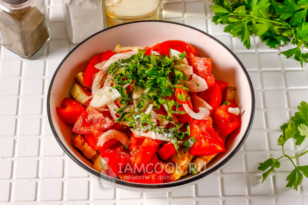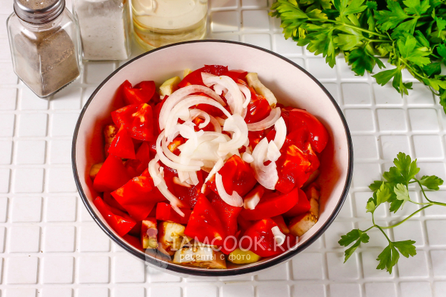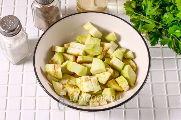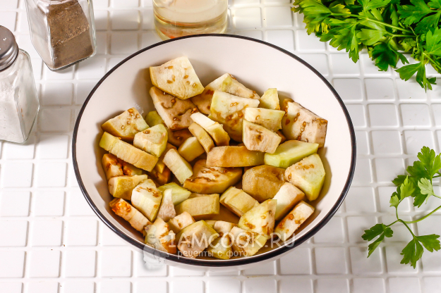 Баклажаны, помидоры промойте в воде, срежьте с баклажана хвостики и кожуру, нарежьте средними кубиками или полушайбочками. Высыпьте нарезку в глубокую миску, салатник и т.д.
