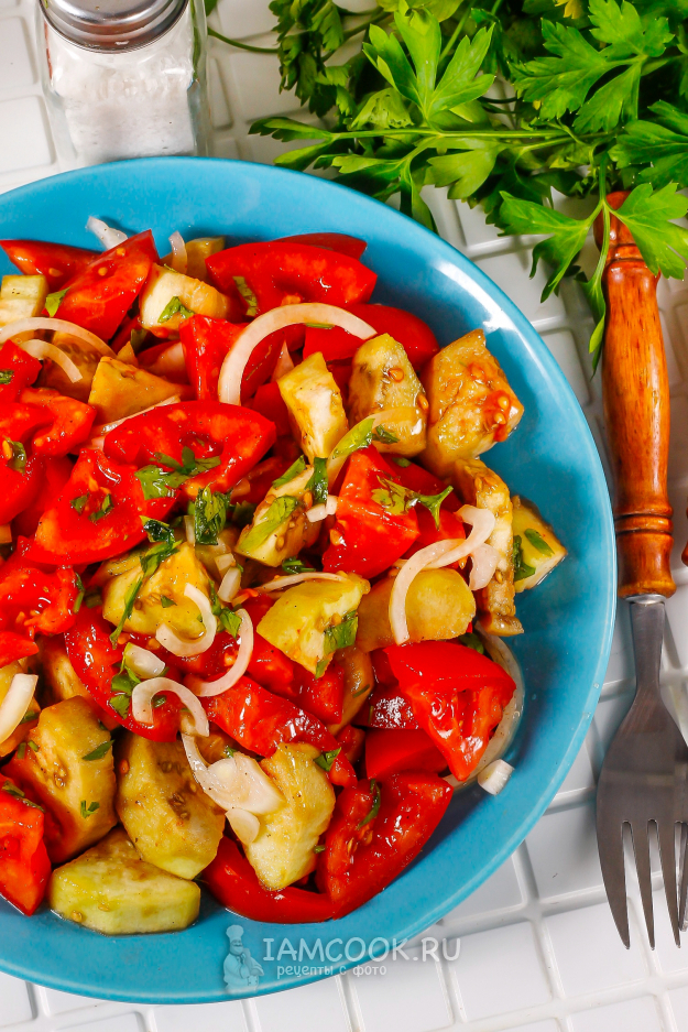 Выложите салат из сырых баклажанов с помидорами на тарелку и подайте к столу. Однако блюдо будет куда вкуснее, если оно пропитается ароматами других овощей примерно 30 минут на холоде.