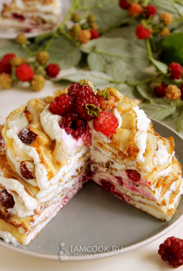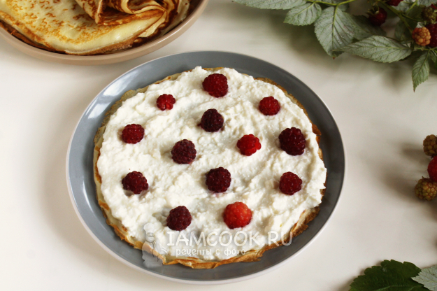Чтобы приготовить блинный торт с малиной и творогом, возьмите продукты по списку.