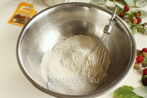 Первыми перемешайте сухие компоненты (муку, сахар, соль, ваниль).