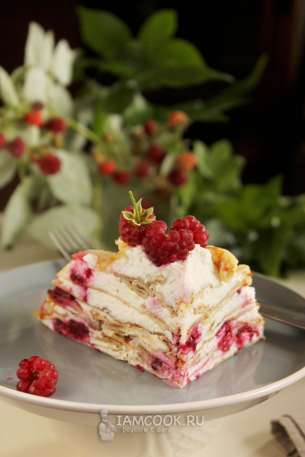 Собрав, выдержите блинный торт с малиной и творожным кремом в холодильнике часа два, потом разрежьте порционными треугольниками. Перед подачей можно посыпать просеянной сахарной пудрой.