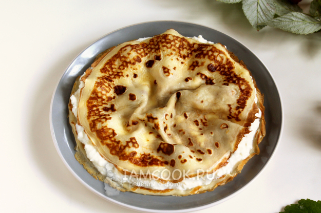 Если планируете торт в виде купола, накрывайте начинку и слегка собирайте очередной блин по центру.