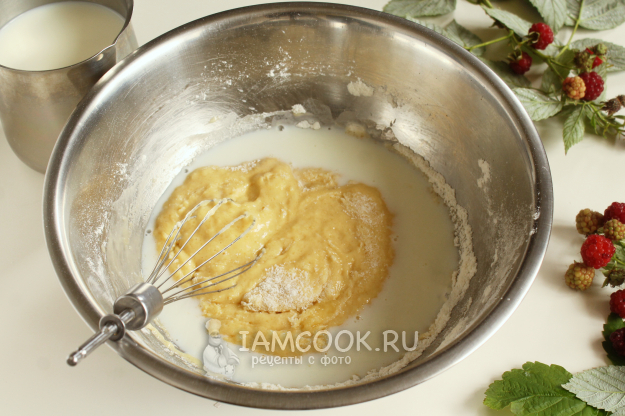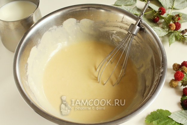 Частями вливайте чуть теплое молоко и продолжайте взбивать-разводить густое тесто.