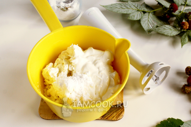 Для прослойки перетрите творог, сметану и сахарную пудру.