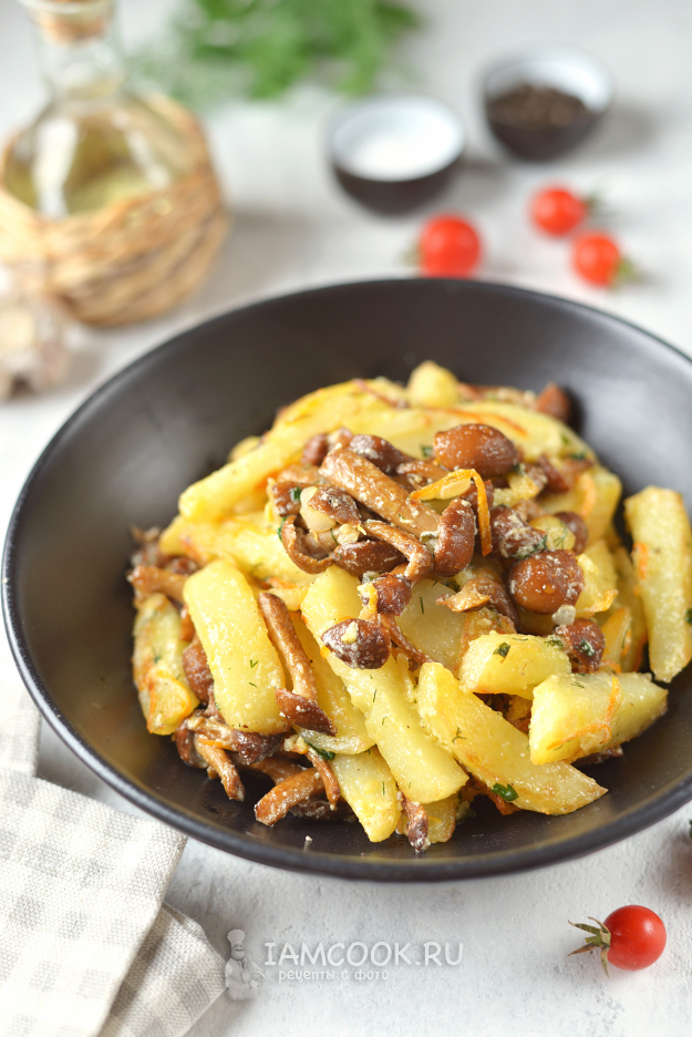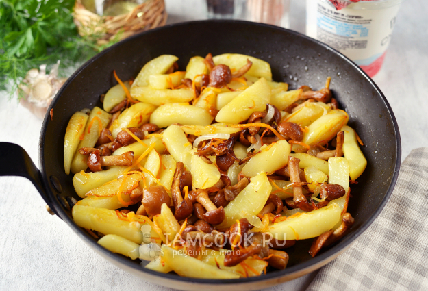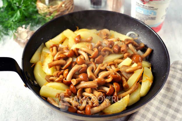 Добавьте в сковороду грибы, жарьте все вместе еще минут 5-7. Сковороду нужно будет прикрыть крышкой, поскольку опята начнут сильно "стрелять".