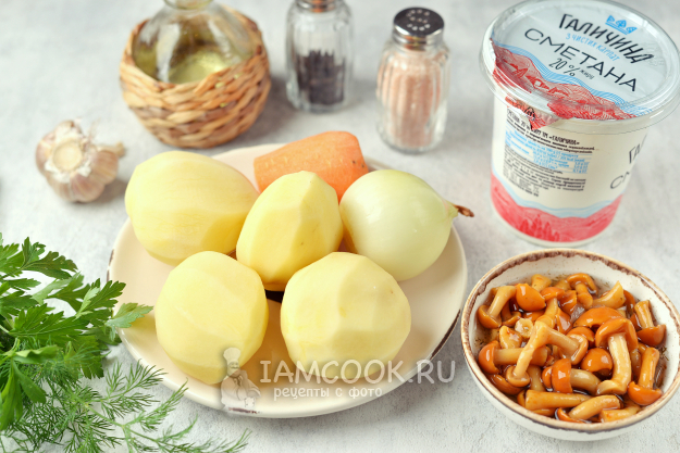 Возьмите все необходимые продукты для приготовления жареных опят с картошкой в сметане. Картофель, лук, морковь и чеснок почистите, помойте.