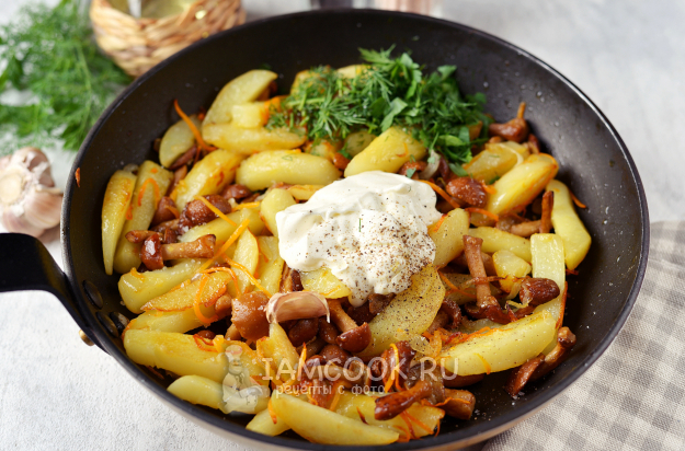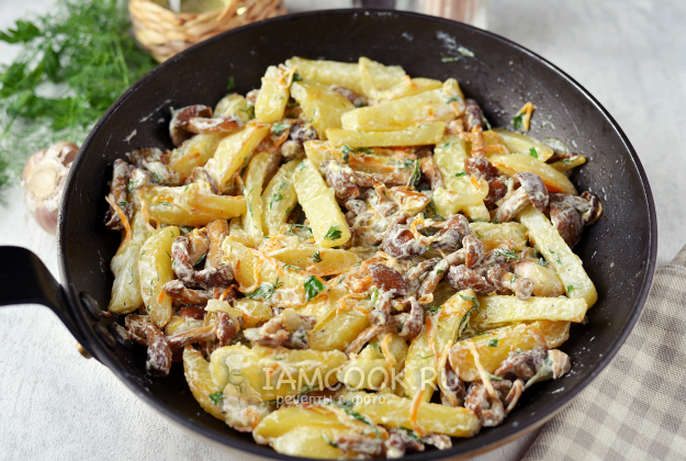 Жареные опята с картошкой в сметане готовы, разложите по порционным тарелкам, и можно подавать как самостоятельное блюдо.