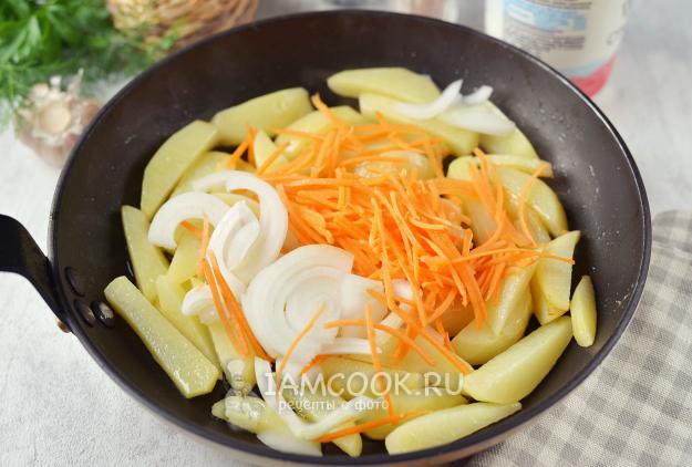 Добавьте в сковороду нарезанный полукольцами лук и нашинкованную морковь, перемешайте и жарьте еще минут 5-7 на умеренном огне.