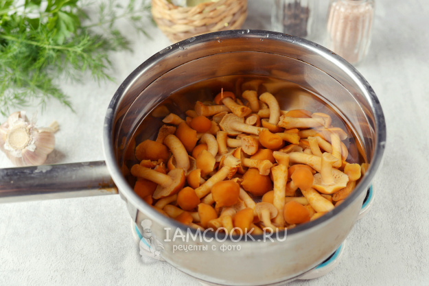 Маринованные опята промойте в холодной воде несколько раз, смойте всю слизь. Отварите в чистой воде минут 10, чтобы убрать уксусный привкус. Отваренные опята откиньте на дуршлаг.