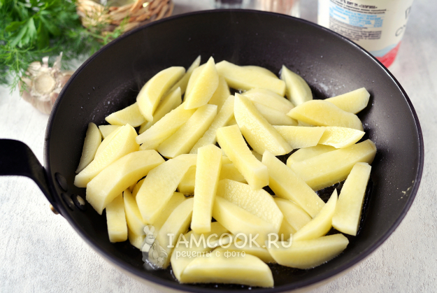 Разогрейте в сковороде растительное масло, выложите в него нарезанный крупной соломкой картофель, жарьте минут 5 на умеренном огне.