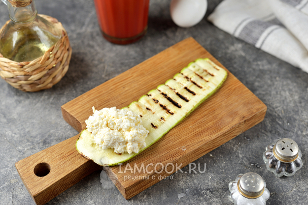Выложите полную столовую ложку сырной начинки на слайс кабачка, сверните рулетом.