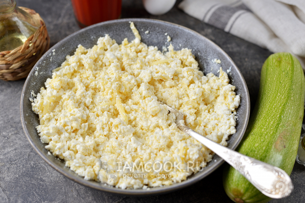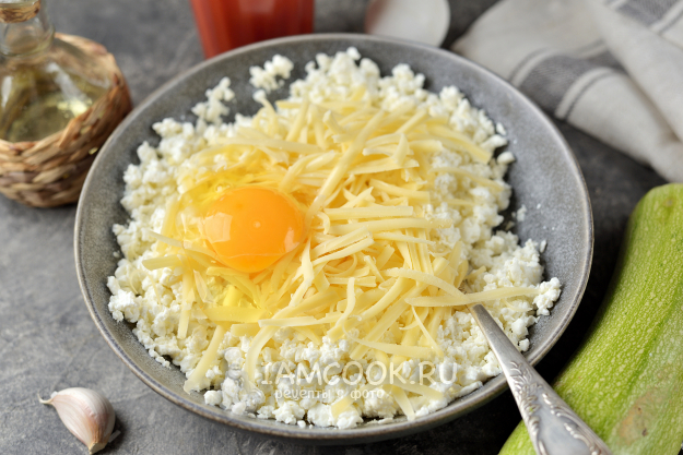 Творог разотрите вилкой с крупными зубцами, добавьте большую часть твердого сыра, яйцо, чеснок, соль и перец по вкусу.