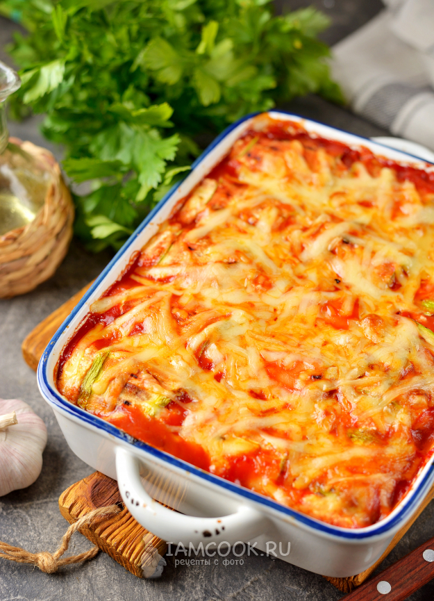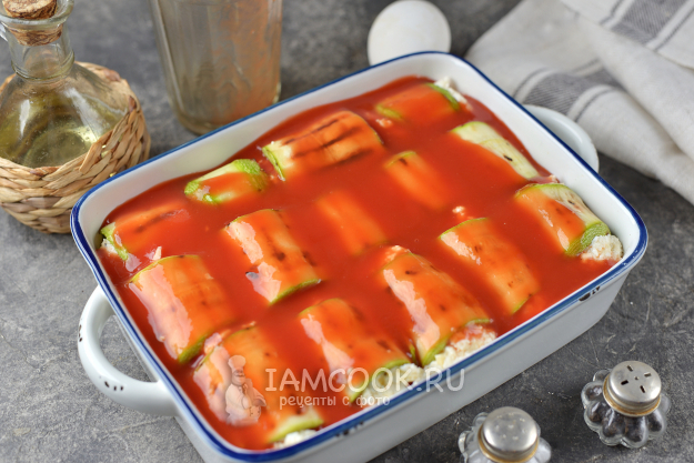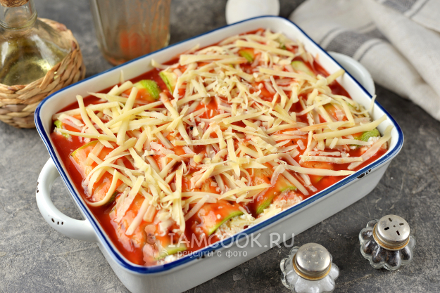 То же самое проделайте с остальными продуктами, переложите рулетики в огнеупорную форму.