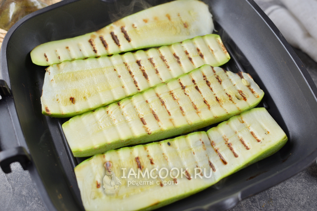 Кабачки нарежьте тонкими длинными слайсами, обжарьте на сухой сковороде-гриль. Также слайсы можно смазать слегка растительным маслом и запечь в духовке около 15 минут.