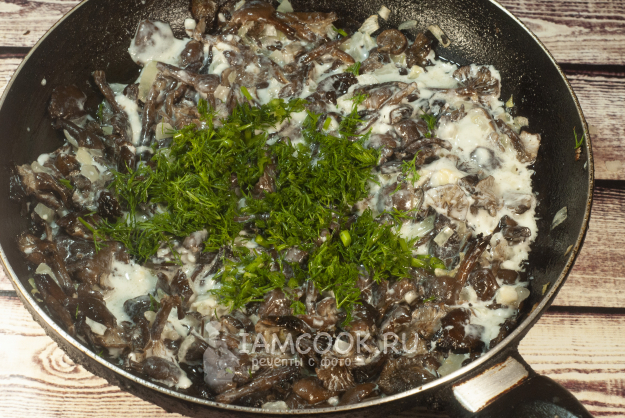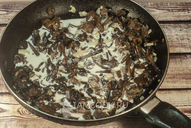 Сливочный соус добавляем к грибам. Прожариваем, помешивая, 5-7 минут. Соус загустеет. Еще раз попробуем грибы, теперь уже с соусом. Если нужно, подсолим.