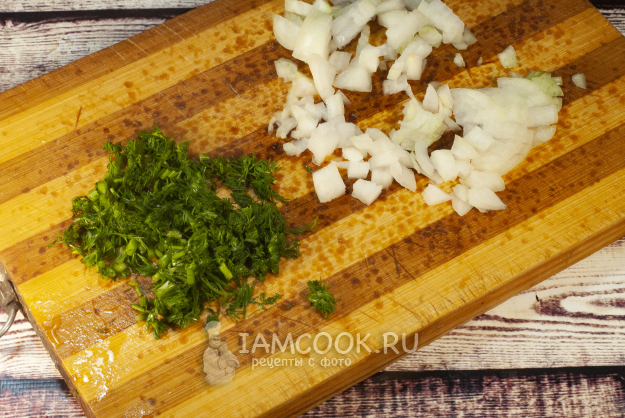 Лук чистим и нарезаем мелко. Укроп промываем и тоже мелко нарезаем.