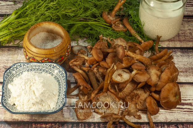 Возьмём ингредиенты для приготовления опят в сливочном соусе. Сливки можно использовать любой жирности, у меня 15-процентные. На фото ингредиентов отсутствуют репчатый лук и подсолнечное масло. По желанию можно добавить перец.