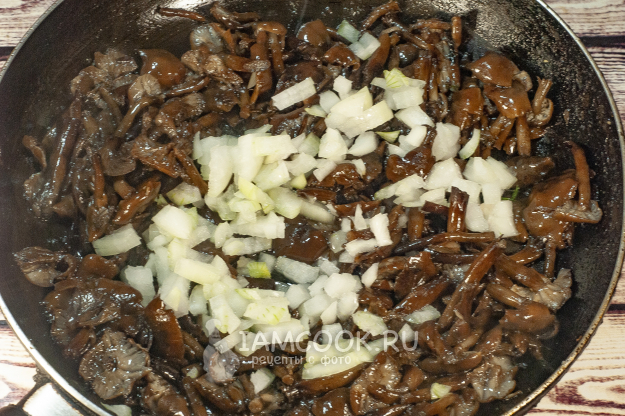 На сковороде разогреваем подсолнечное масло. Выкладываем грибы и обжариваем на огне чуть больше среднего минут 5-7, помешивая. Добавляем лук к грибам и обжариваем минут 10-15, пока лук не станет мягким и не поджарится до легкого золотого цвета. Пробуем грибы на соль, подсаливаем на свой вкус, если любите, то добавляете перец черный. Я не добавляла.