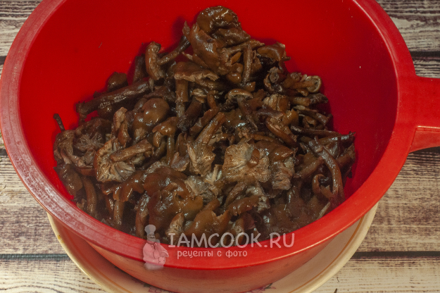 Грибы перебираем, удаляем листочки, веточки, палочки и другой лесной мусор, если он случайно попался. Хорошо промываем грибы в нескольких водах. Отварим опята в подсоленной воде минут 30-40 с момента закипания. Пену собираем. Сваренные опята откидываем на дуршлаг и снова хорошо промываем под струей холодной воды. Подождем, пока вода стечет.