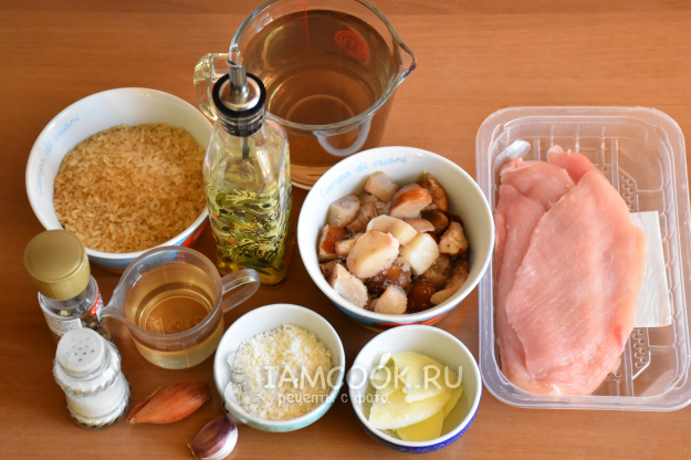 Для приготовления ризотто с индейкой и грибами нам понадобятся следующие ингредиенты.