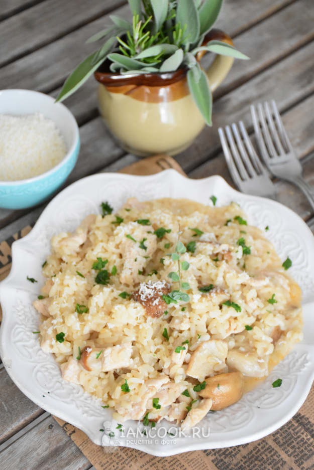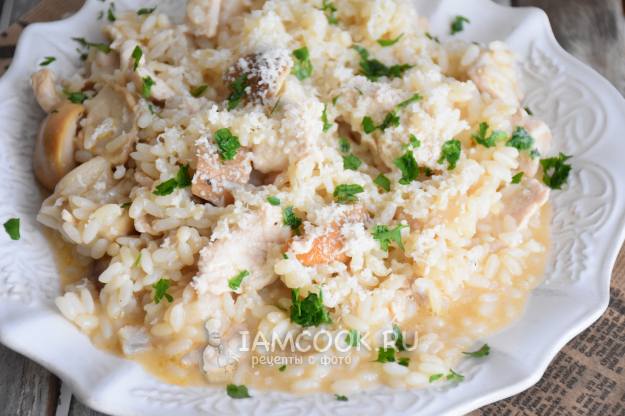 Ризотто с индейкой и грибами готово. По желанию перед подачей посыпать мелко нарезанной петрушкой. Подавать сразу же!