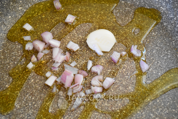 В глубокой сковороде разогреть оливковое масло и обжарить зубчик чеснока и мелко нарезанный лук–шалот до прозрачности. Чеснок вынуть.