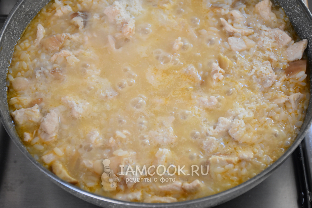 Затем постепенно добавляем по одному половнику горячего бульона и каждый раз перемешиваем рис, пока он не впитает жидкость. Готовим 15 минут.