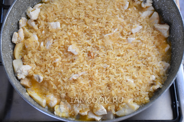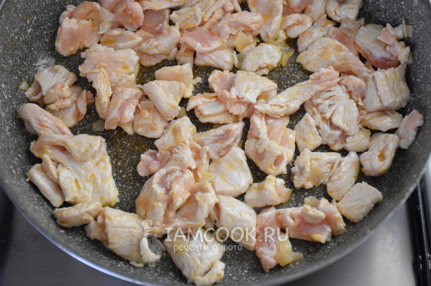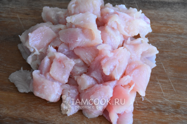 Бульон или воду поставить на слабый огонь. В процессе приготовления ризотто необходимо постоянно подливать горячий бульон в рис. Филе индейки промыть, обсушить бумажным полотенцем и нарезать небольшими кусочками.