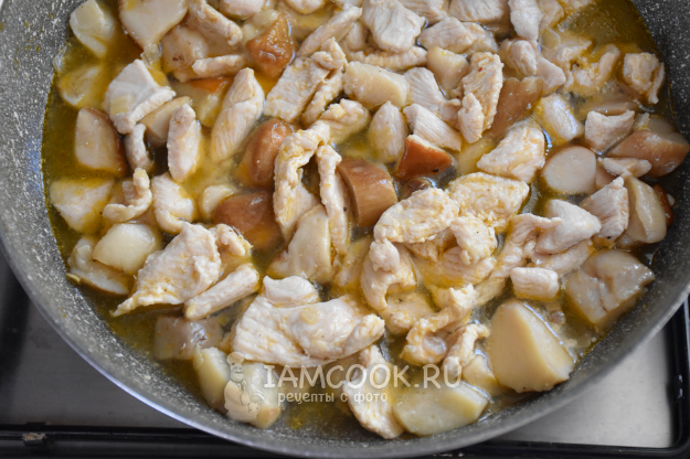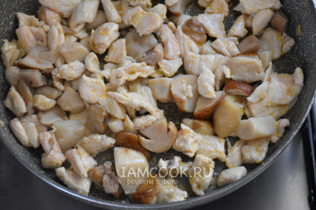 Добавить грибы, посолить, поперчить и готовить до выпаривания жидкости.