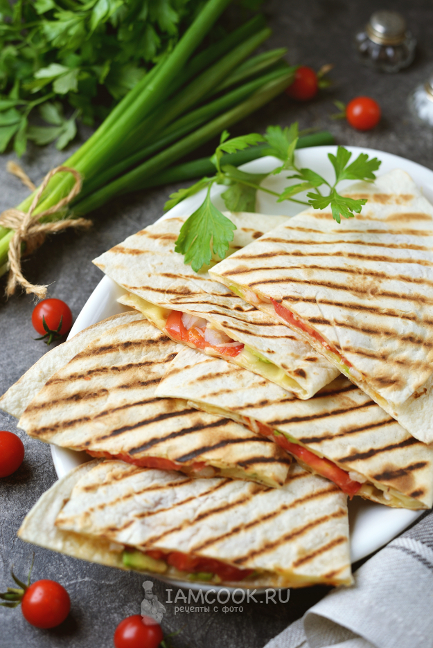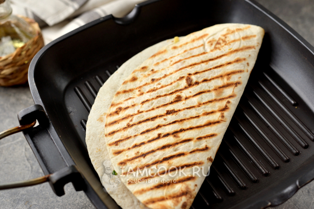 Сложите тортилью пополам, быстро поджарьте на горячей сковороде-гриль до легких подпалин.