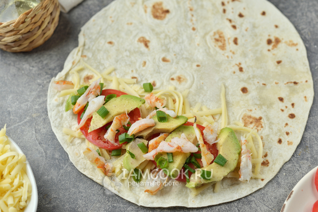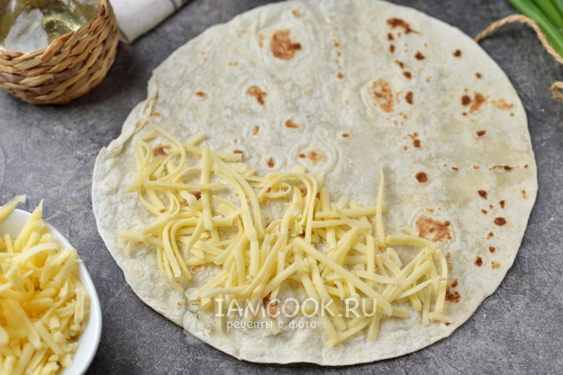 Выложите тортилью на ровную поверхность, присыпьте половину твердым сыром.
