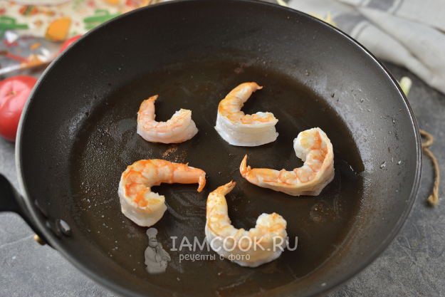 Очистите хвосты креветок от панциря, удалите кишечник, обжарьте минуты по 1,5 с обеих сторон на слегка смазанной растительным маслом сковороде.