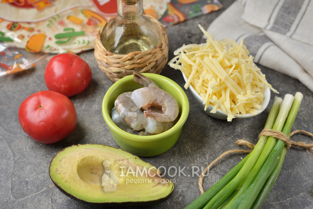 Возьмите все необходимое по списку для приготовления кесадильи с креветками и авокадо. Хвосты крупных креветок разморозьте. Помойте лук и помидоры, обсушите.