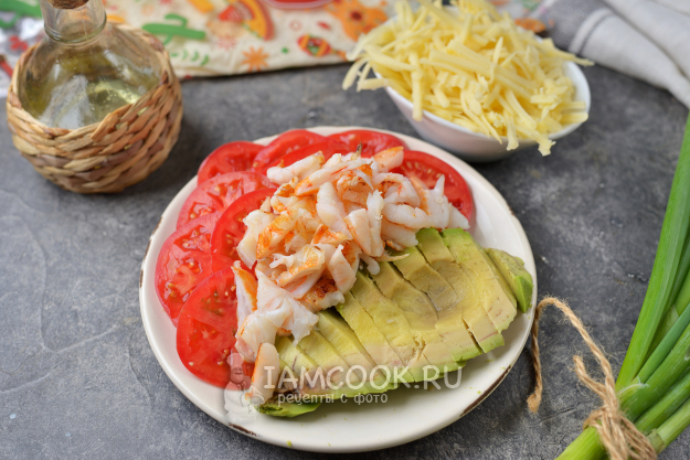 Спелое авокадо и помидор нарежьте тонкими ломтиками, нарубите мелко креветочные хвосты, натрите твердый сыр на терке.
