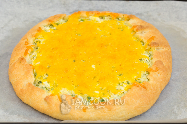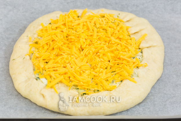 Тесто раскатайте в круг толщиной 3 мм. Перенесите на противень, застеленный пергаментом.