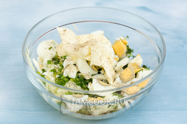 К капусте добавьте нарезанные яйца, лук, укроп, сметану, соль и перец.