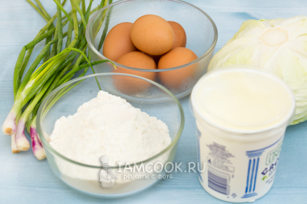 Для приготовления пирога с капустой, яйцом и сыром подготовьте продукты по списку.