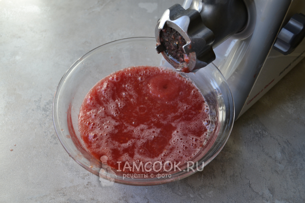 Помидоры прокрутите в мясорубке с самой мелкой решеткой. Так большая часть семян не попадет в томатный сок.