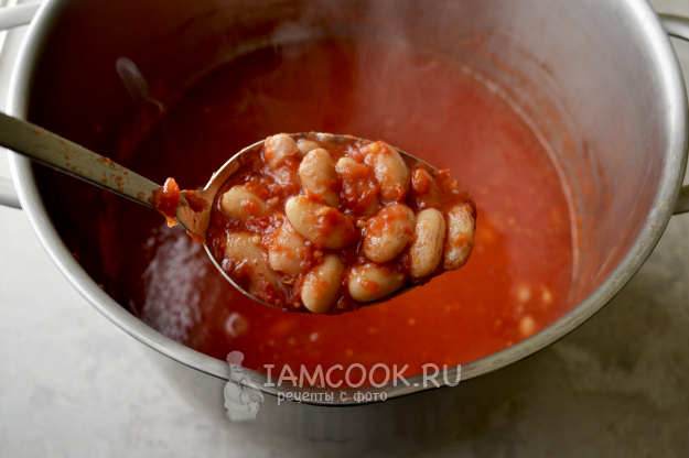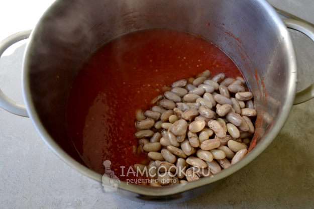 Во время варки объем сока немного уменьшится, сок станет гуще. Положите в сок соль, сахар, молотый перец, кусочек острого красного перца, влейте оливковое или другое растительное масло без запаха, перемешайте и добавьте отварную фасоль.