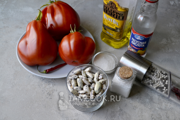 Возьмите продукты для приготовления фасоли в томатном соке на зиму. Помидоры вымойте. Если фасоль сухая, то залейте ее прохладной водой на ночь. Утром воду слейте, фасоль еще раз промойте, залейте чистой водой и сварите до готовности.