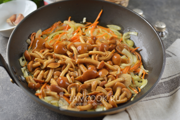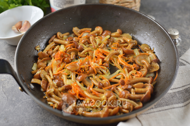 Жарьте на умеренном огне до румяной корочки. Сковороду нужно будет прикрыть крышкой, поскольку опята начнут сильно "стрелять" и "выпрыгивать" из сковороды по всей кухне))).