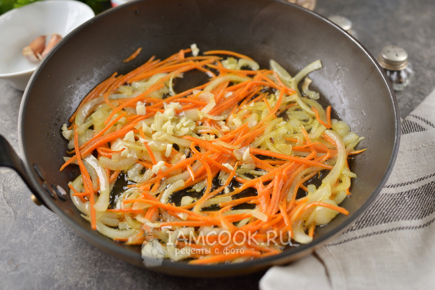 А пока грибы варятся, разогрейте в сковороде растительное масло, выложите в него нарезанные лук, морковь и измельченный чеснок, жарьте около минуты до мягкости.