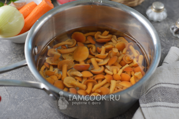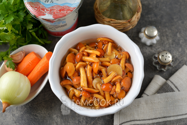 Тщательно промойте грибы от слизи, залейте чистой холодной водой, отварите минут 10, нужно убрать всю соль или уксус. Если у вас свежие опята, то их нужно отварить в течение 30 минут.