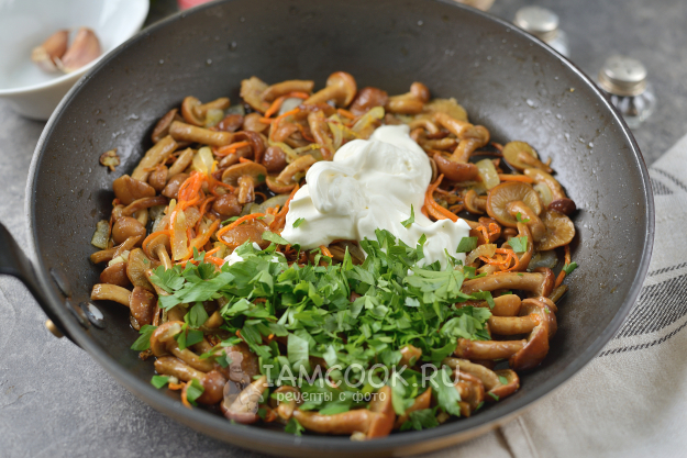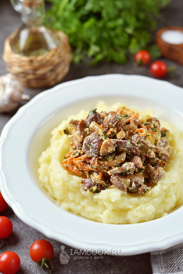 Жареные консервированные опята со сметаной и луком готовы. Подавать их вкуснее всего с картофельным пюре, просто идеальное сочетание.