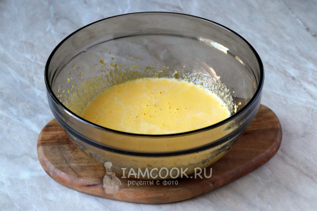 Во взбитые желтки влейте молоко комнатной температуры и перемешайте.