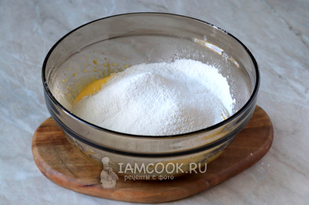Затем введите просеянную пшеничную муку, смешанную с разрыхлителем.