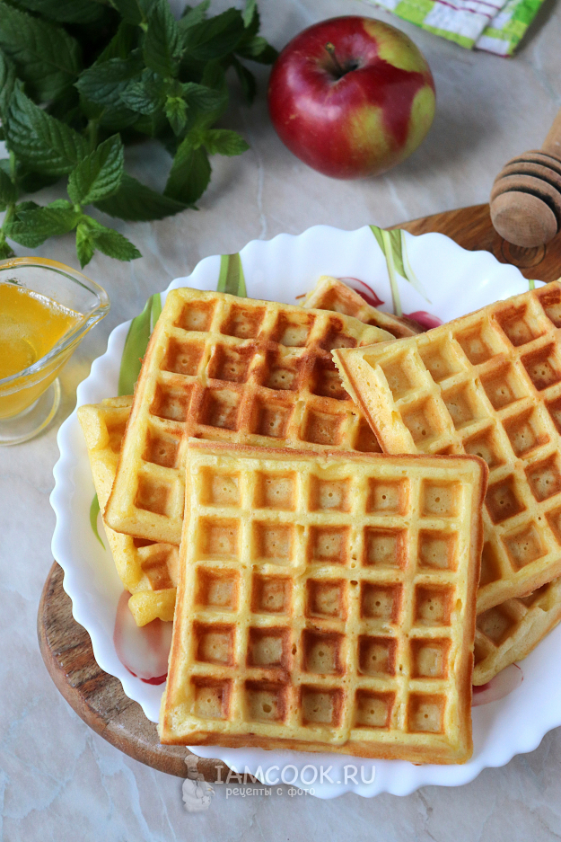 Вкуснейшие венские вафли с яблоком готовы. Переложите их на металлическую решётку и дайте немного остыть. На стол подавайте вафли в сочетании с мёдом, сгущённым молоком и т.п.