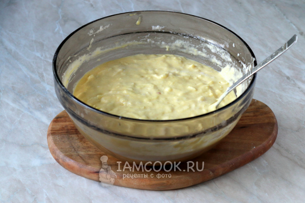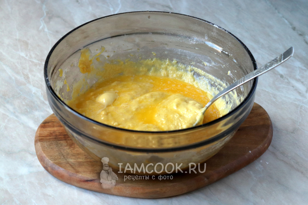 Снова перемешайте, чтобы не было мучных комочков, и добавьте растопленное сливочное масло.